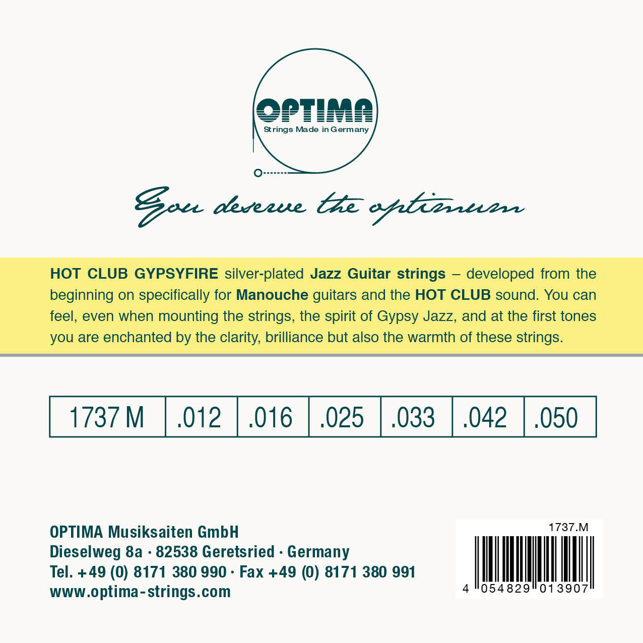 OPTIMA HOT CLUB GYPSYFIRE ? a name with a statement ? Strings that have been developed from the beginning on specifically for Manouche guitars and the HOT CLUB sound. You can feel, even when mounting the strings, the spirit of gypsy jazz, and at the first tones, you are enchanted by the clarity, brilliance but also he warmth of these strings. Made with ball end. Silver roundwound, with loop end.