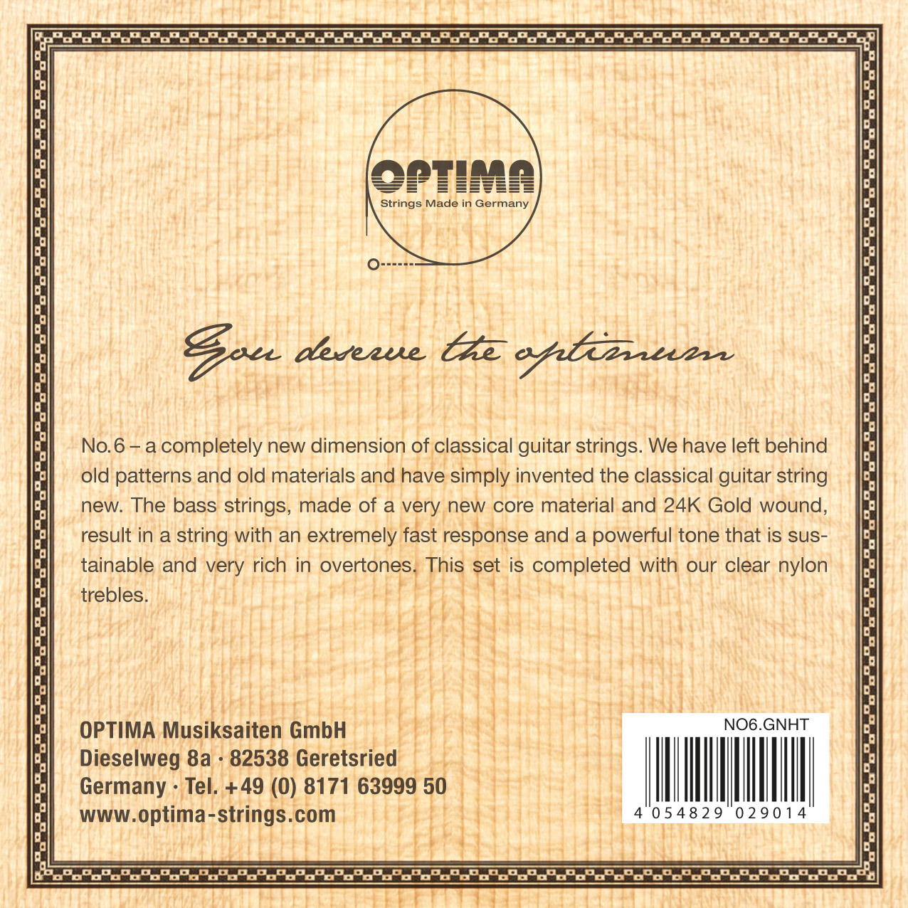 OPTIMA No.6 ? Every concert guitarist should remember the name of these strings, because they bring forth an entirely new dimension. We have left behind old patterns and materials and have merely reinvented the classical guitar string. The bass strings are made with a wholly new core material, wound with a 24 Karat Gold plated wire, resulting in a string with an extraordinary fast response, a powerful sustainable tone very rich in overtones, where the sound spectrum remains perfectly balanced. The set is completed with our Clear Nylon treble strings.