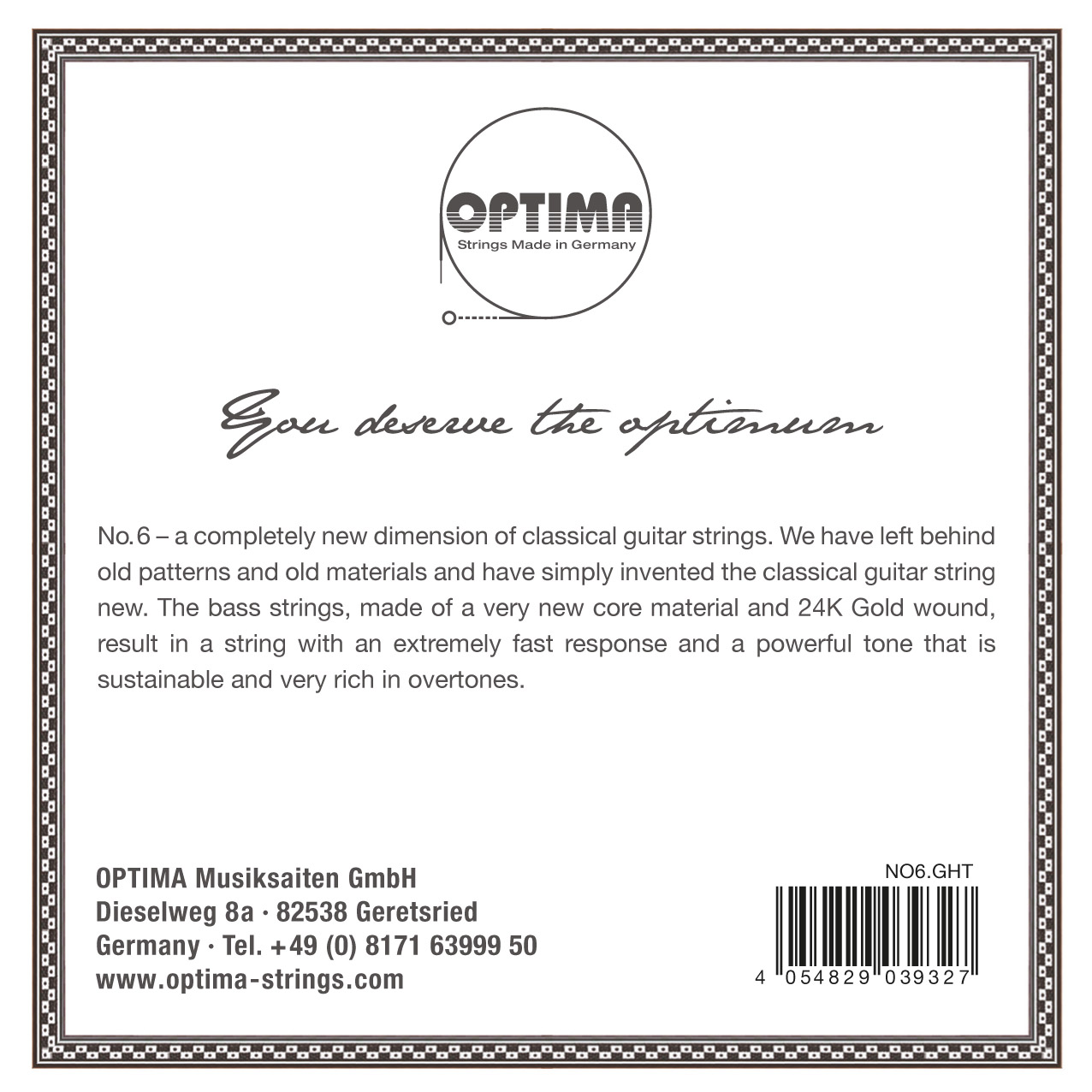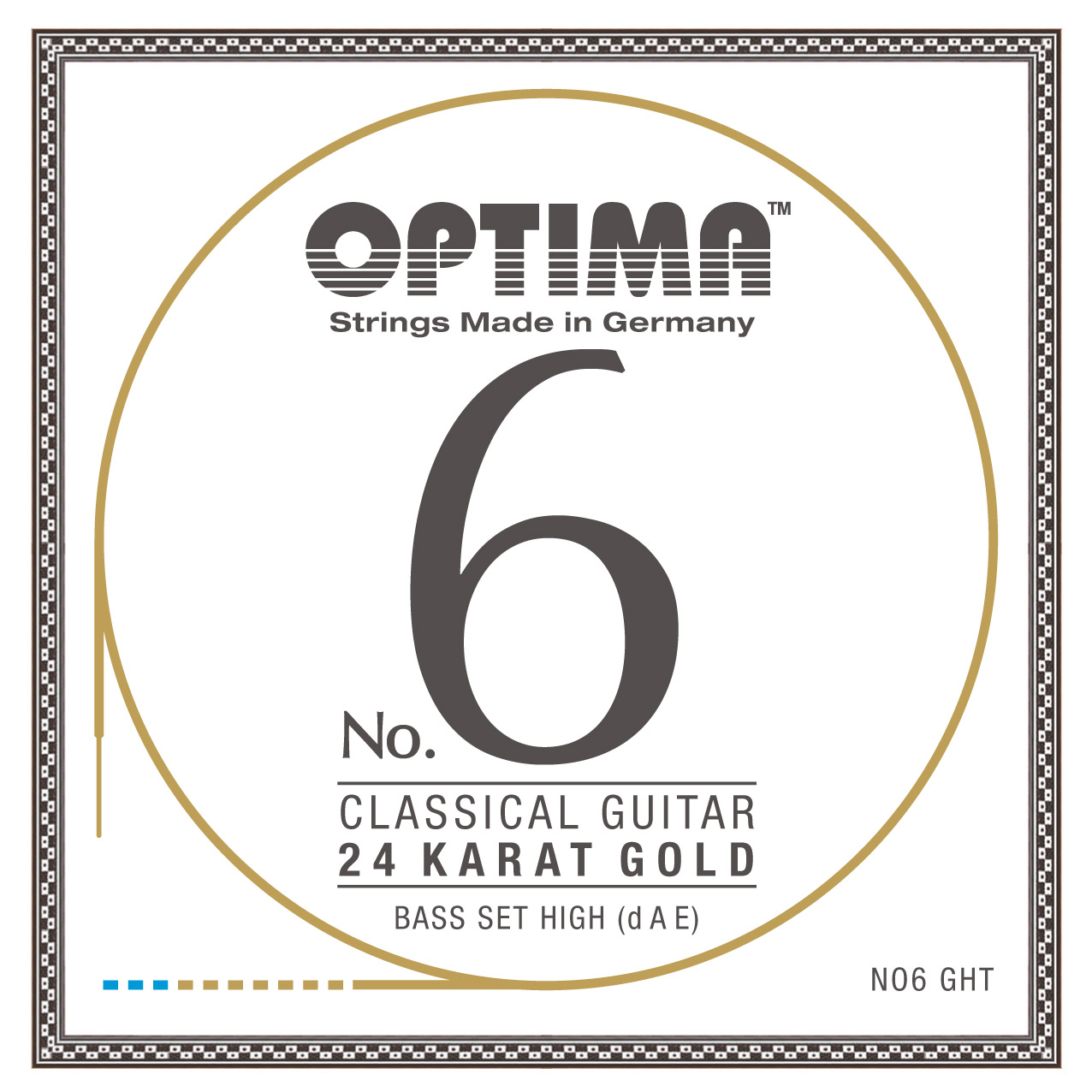 OPTIMA No.6 ? Every concert guitarist should remember the name of these strings, because they bring forth an entirely new dimension. We have left behind old patterns and materials and have merely reinvented the classical guitar string. The bass strings are made with a wholly new core material, wound with a 24 Karat Gold plated wire, resulting in a string with an extraordinary fast response, a powerful sustainable tone very rich in overtones, where the sound spectrum remains perfectly balanced.