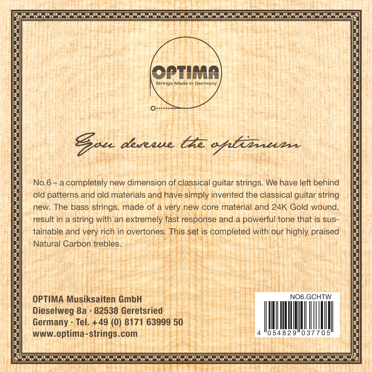 OPTIMA No.6 ? Every concert guitarist should remember the name of these strings, because they bring forth an entirely new dimension. We have left behind old patterns and materials and have merely reinvented the classical guitar string. The bass strings are made with a wholly new core material, wound with a 24 Karat Gold plated wire, resulting in a string with an extraordinary fast response, a powerful sustainable tone very rich in overtones, where the sound spectrum remains perfectly balanced. The set is completed with or our highly praised Natural Carbon treble strings.