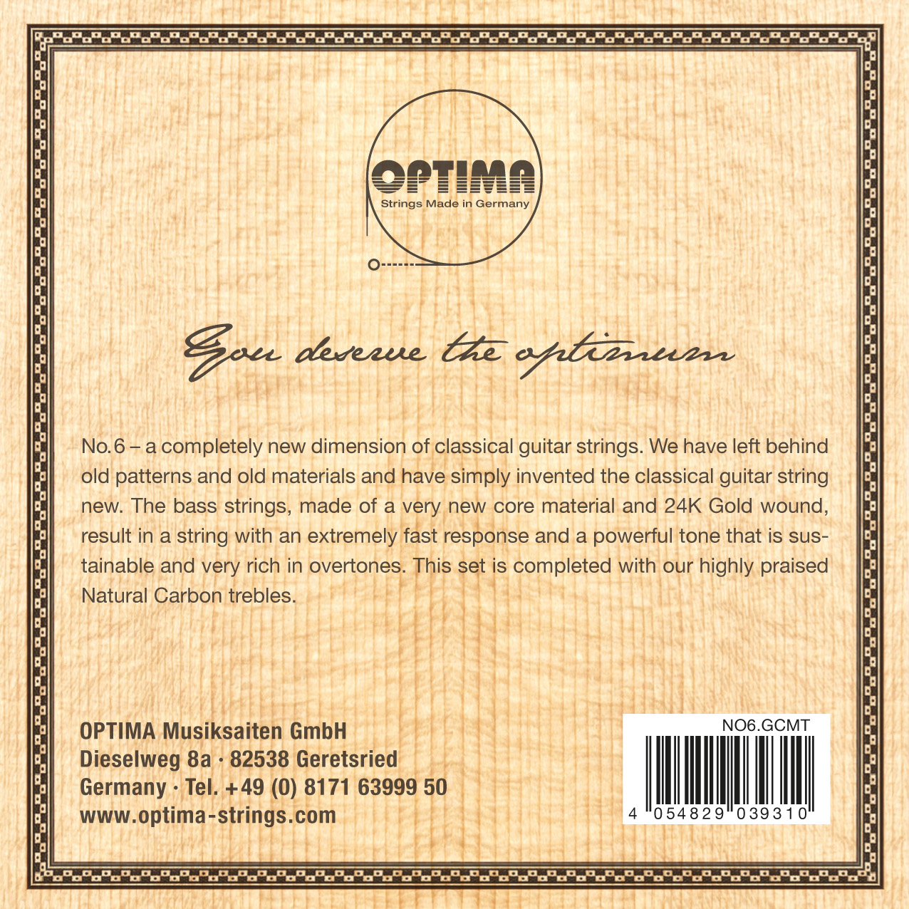 OPTIMA No.6 ? Every concert guitarist should remember the name of these strings, because they bring forth an entirely new dimension. We have left behind old patterns and materials and have merely reinvented the classical guitar string. The bass strings are made with a wholly new core material, wound with a 24 Karat Gold plated wire, resulting in a string with an extraordinary fast response, a powerful sustainable tone very rich in overtones, where the sound spectrum remains perfectly balanced. The set is completed with or our highly praised Natural Carbon treble strings.