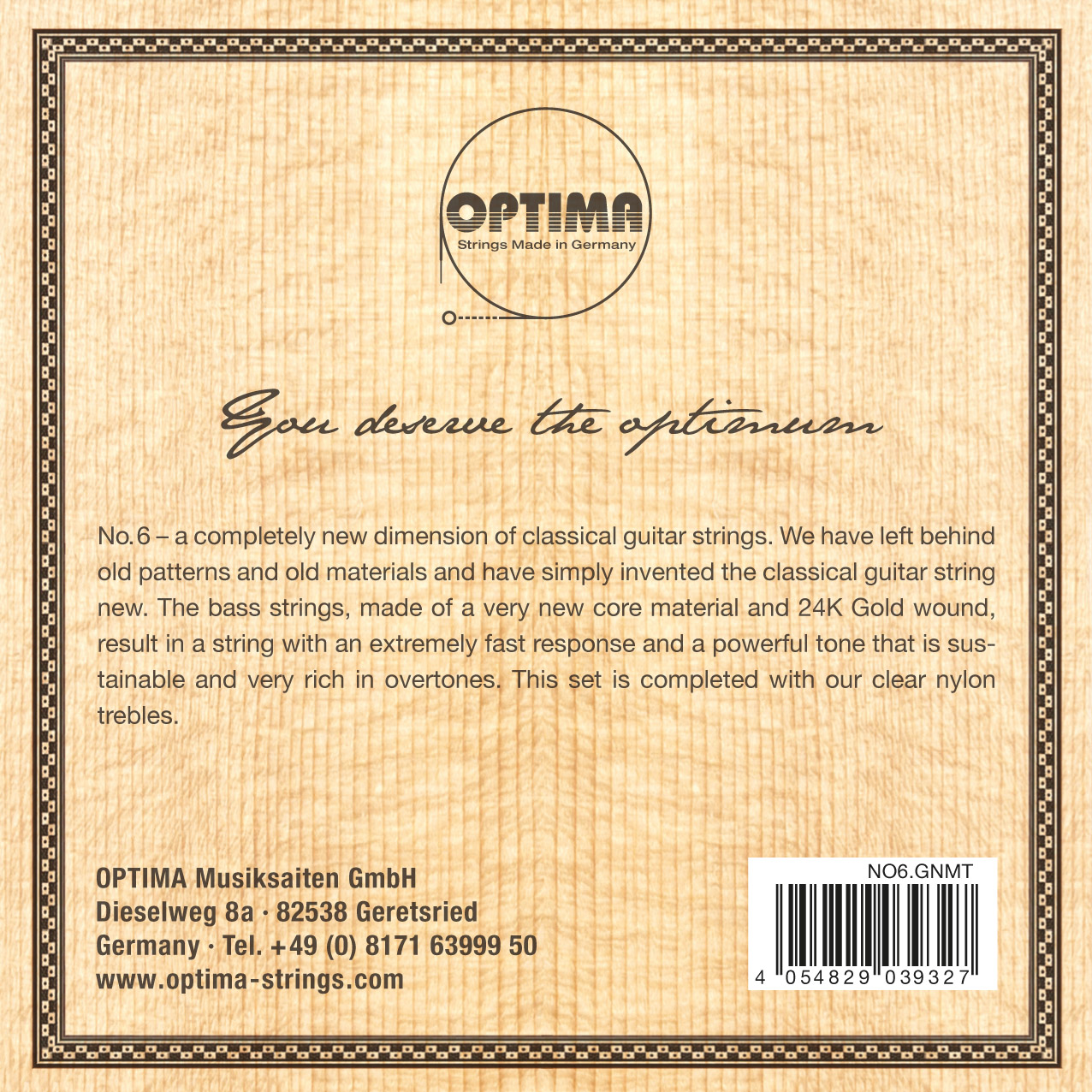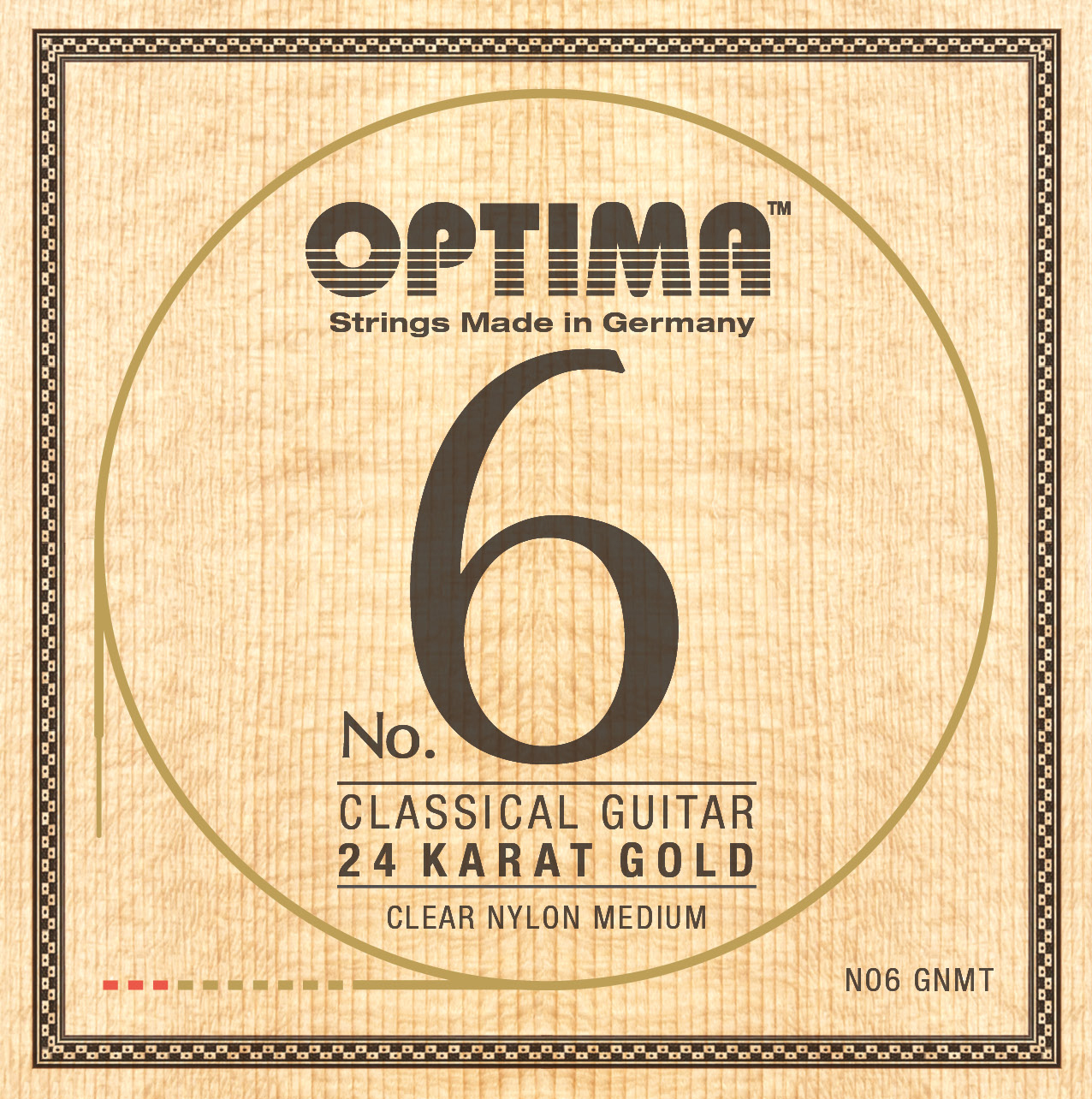 OPTIMA No.6 ? Every concert guitarist should remember the name of these strings, because they bring forth an entirely new dimension. We have left behind old patterns and materials and have merely reinvented the classical guitar string. The bass strings are made with a wholly new core material, wound with a 24 Karat Gold plated wire, resulting in a string with an extraordinary fast response, a powerful sustainable tone very rich in overtones, where the sound spectrum remains perfectly balanced. The set is completed with our Clear Nylon treble strings.