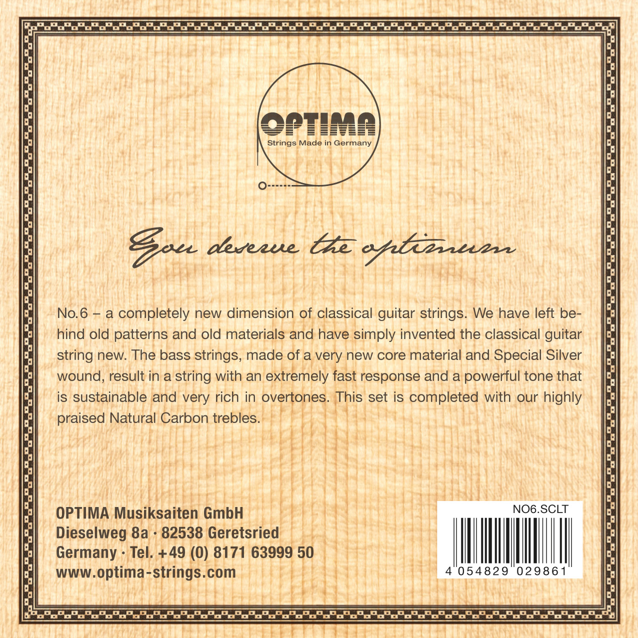 OPTIMA No.6 ? Every concert guitarist should remember the name of these strings, because they bring forth an entirely new dimension. We have left behind old patterns and materials and have merely reinvented the classical guitar string. The bass strings are made with a wholly new core material, wound with a 24 Karat Gold plated wire, resulting in a string with an extraordinary fast response, a powerful sustainable tone very rich in overtones, where the sound spectrum remains perfectly balanced.