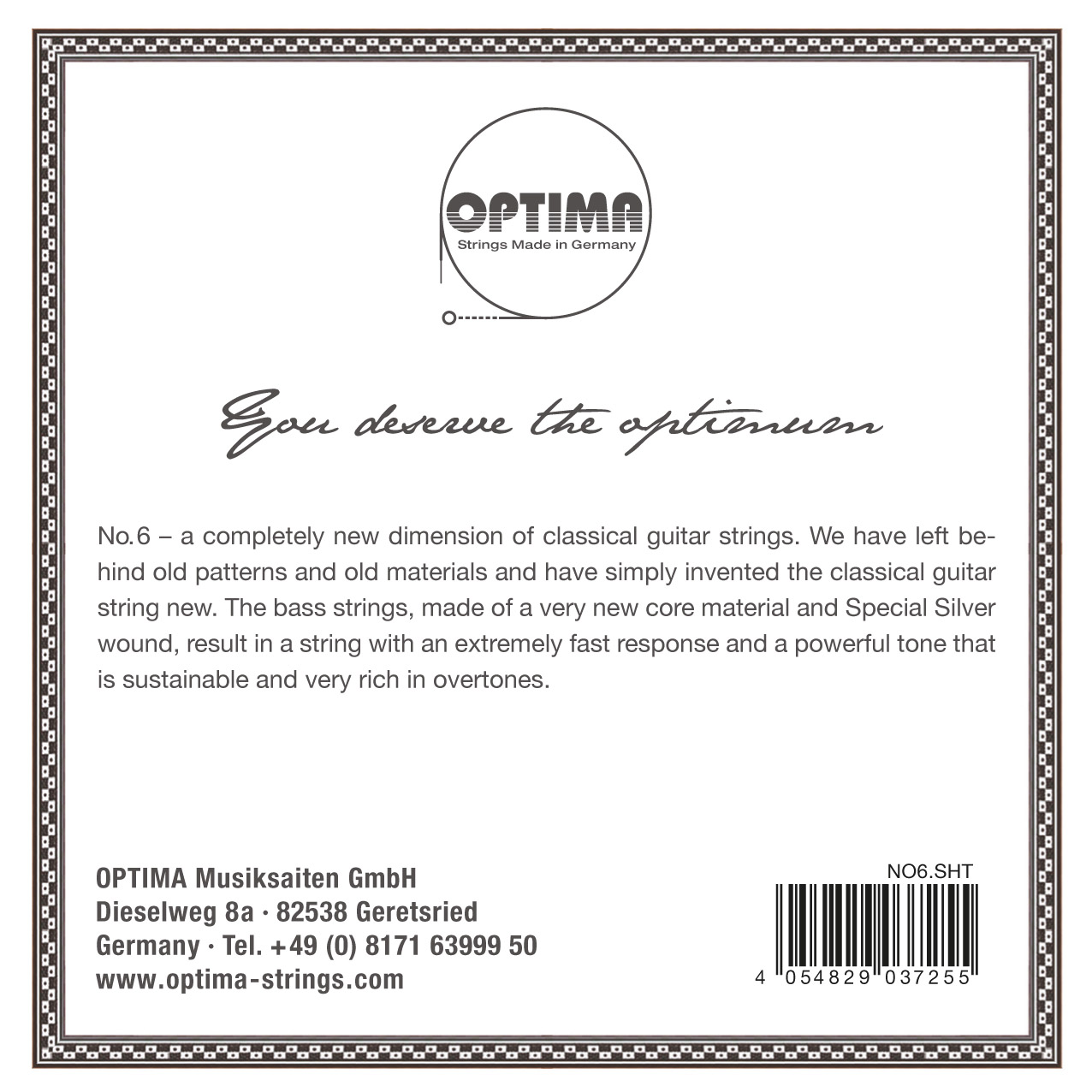 OPTIMA No.6 ? Every concert guitarist should remember the name of these strings, because they bring forth an entirely new dimension. We have left behind old patterns and materials and have merely reinvented the classical guitar string. The bass strings are made with a wholly new core material, wound with a 24 Karat Gold plated wire, resulting in a string with an extraordinary fast response, a powerful sustainable tone very rich in overtones, where the sound spectrum remains perfectly balanced.