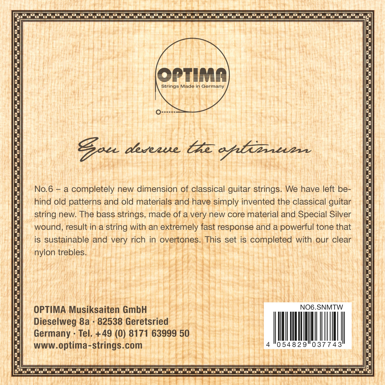 OPTIMA No.6 ? Every concert guitarist should remember the name of these strings, because they bring forth an entirely new dimension. We have left behind old patterns and materials and have merely reinvented the classical guitar string. The bass strings are made with a wholly new core material, wound with a 24 Karat Gold plated wire, resulting in a string with an extraordinary fast response, a powerful sustainable tone very rich in overtones, where the sound spectrum remains perfectly balanced.