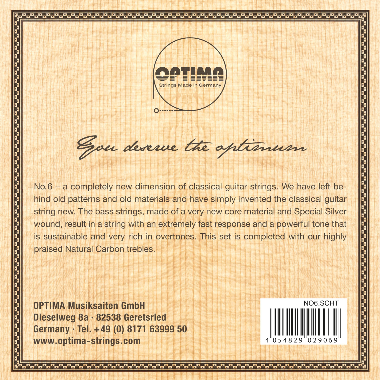 OPTIMA No.6 ? Every concert guitarist should remember the name of these strings, because they bring forth an entirely new dimension. We have left behind old patterns and materials and have merely reinvented the classical guitar string. The bass strings are made with a wholly new core material, wound with a 24 Karat Gold plated wire, resulting in a string with an extraordinary fast response, a powerful sustainable tone very rich in overtones, where the sound spectrum remains perfectly balanced.