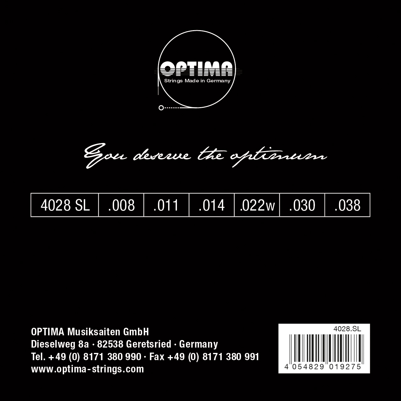 .008 .011 .014 .022w .030 .038 Nickel Plated Steel wound Electric Guitar Strings in roundwound design. The Optima 4028 Reference was developed to provide reliable and consistent playability. The premium NPS alloy ensures even response and stable intonation across the entire set. Developed for musicians who want to rely on their instrument. Developed and produced in Germany.