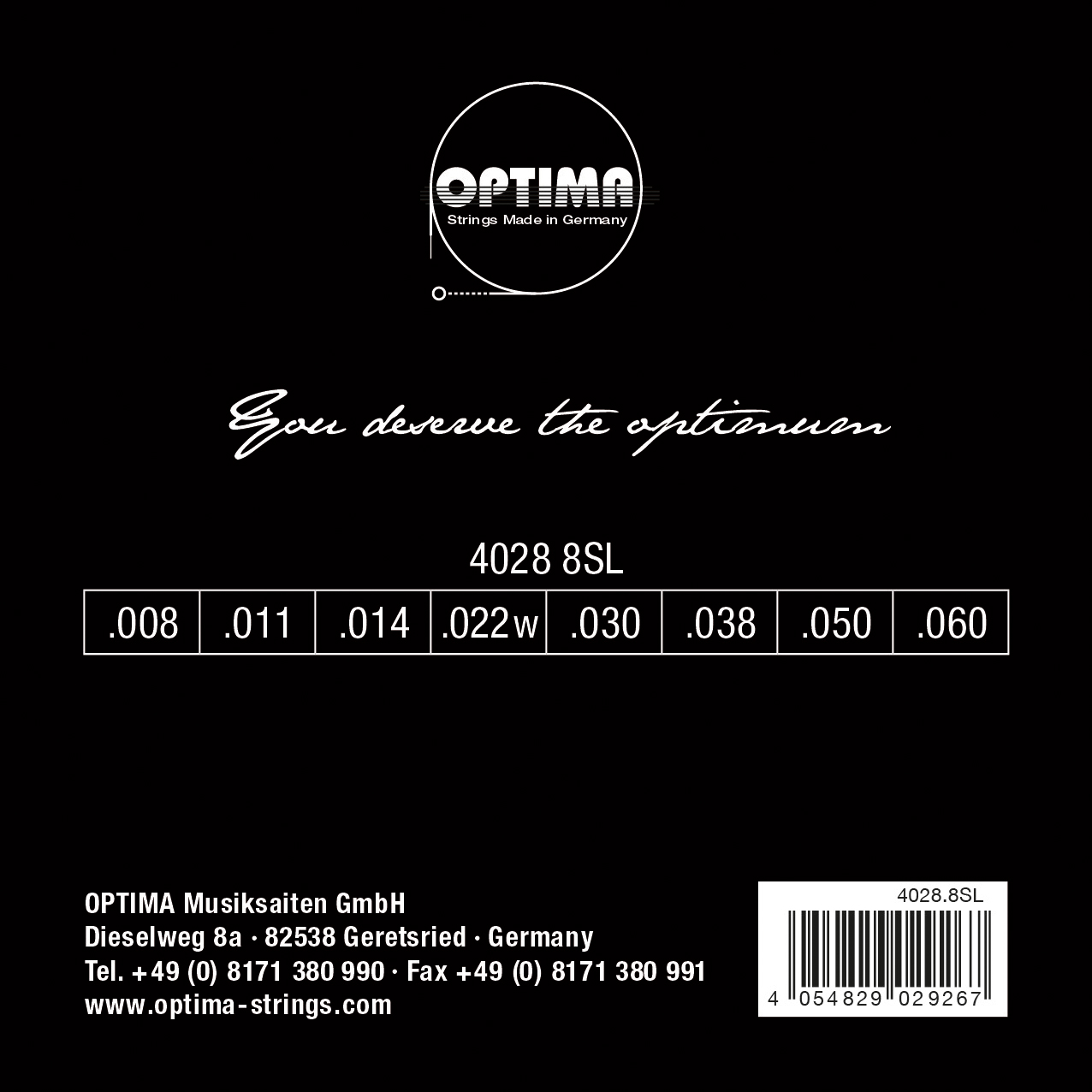 .008 .011 .014 .022w .030 .038 .050 .060 Nickel Plated Steel wound Electric Guitar Strings in roundwound design. The Optima 4028 Reference was developed to provide reliable and consistent playability. The premium NPS alloy ensures even response and stable intonation across the entire set. Developed for musicians who want to rely on their instrument. Developed and produced in Germany.