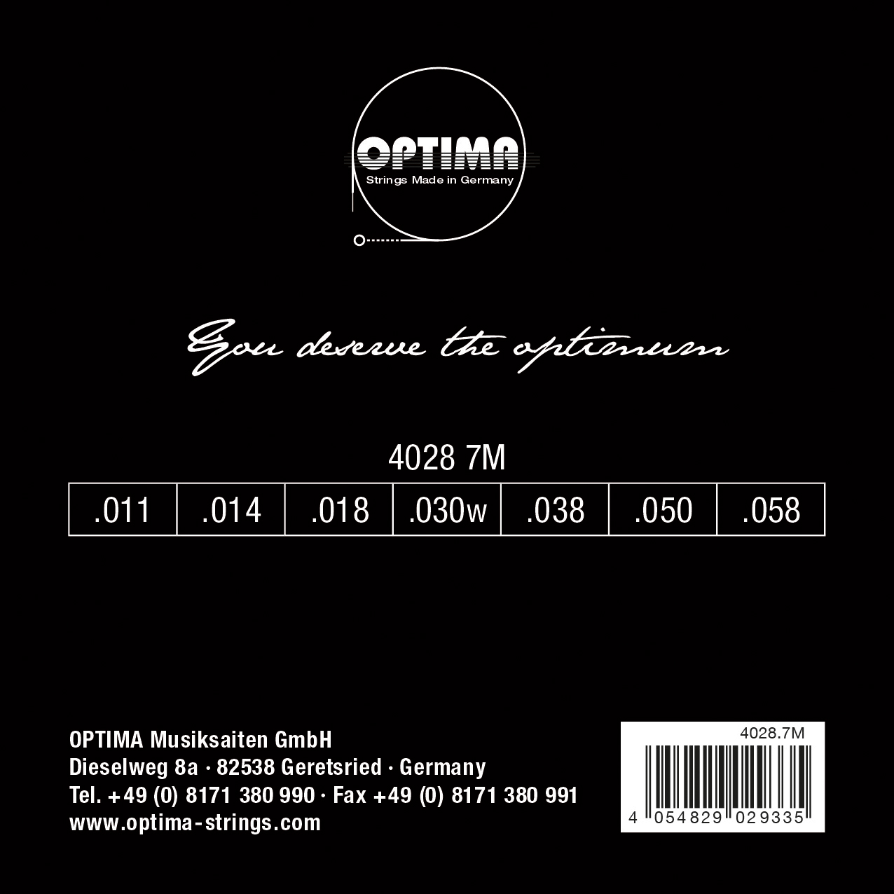 .011 .014 .018 .030w .038 .050 .058 Nickel Plated Steel wound Electric Guitar Strings in roundwound design. The Optima 4028 Reference was developed to provide reliable and consistent playability. The premium NPS alloy ensures even response and stable intonation across the entire set. Developed for musicians who want to rely on their instrument. Developed and produced in Germany.