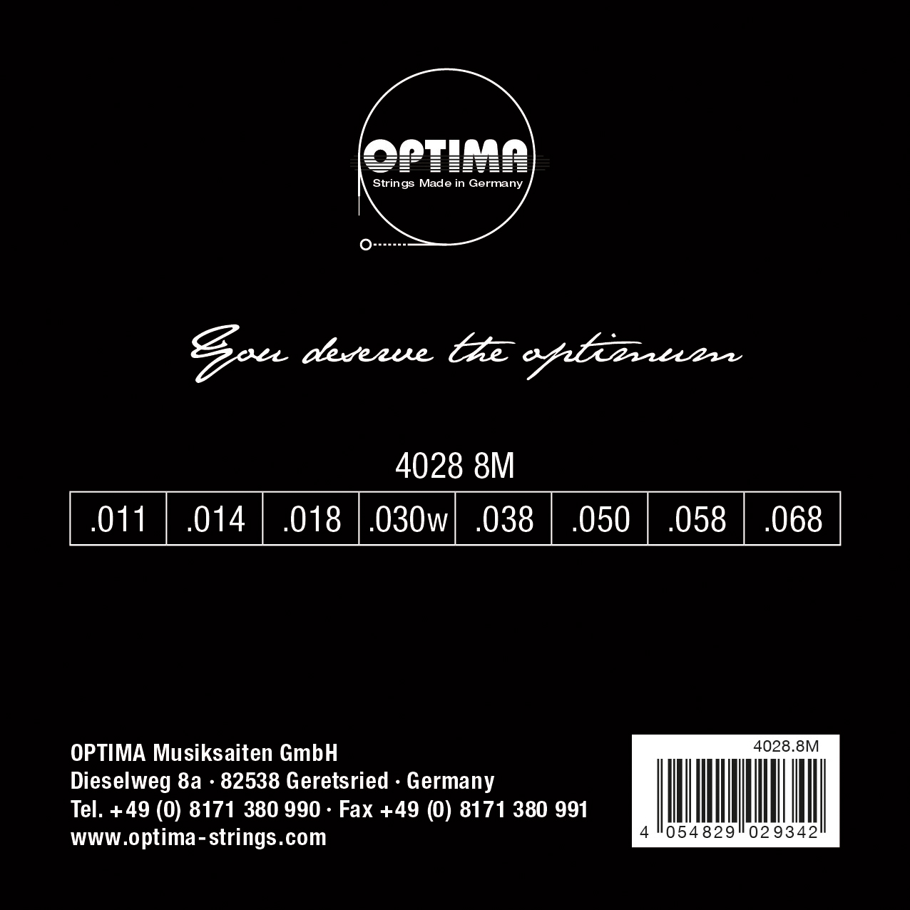 .011 .014 .018 .030w .038 .050 .058 .068 Nickel Plated Steel wound Electric Guitar Strings in roundwound design. The Optima 4028 Reference is designed as a benchmark for intonation response and playability. The premium NPS alloy provides controlled and reproducible magnetic behaviour across the entire set. Developed for clear evaluation and reliable comparability not for effect. Developed and produced in German