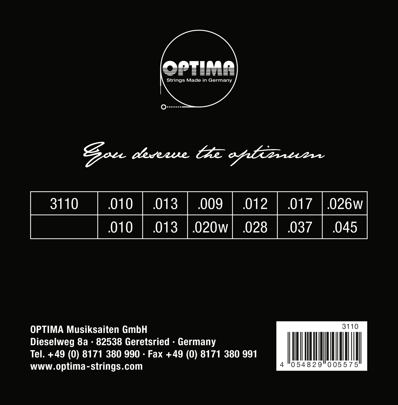 .010 .010 .013 .013 .020w .009 .028w .012 .037w .017 .045w .026w Nickel Plated Steel wound Electric Guitar Strings in roundwound design. The Optima 4028 Reference was developed to provide reliable and consistent playability. The premium NPS alloy ensures even response and stable intonation across the entire set. Developed for musicians who want to rely on their instrument. Developed and produced in Germany.