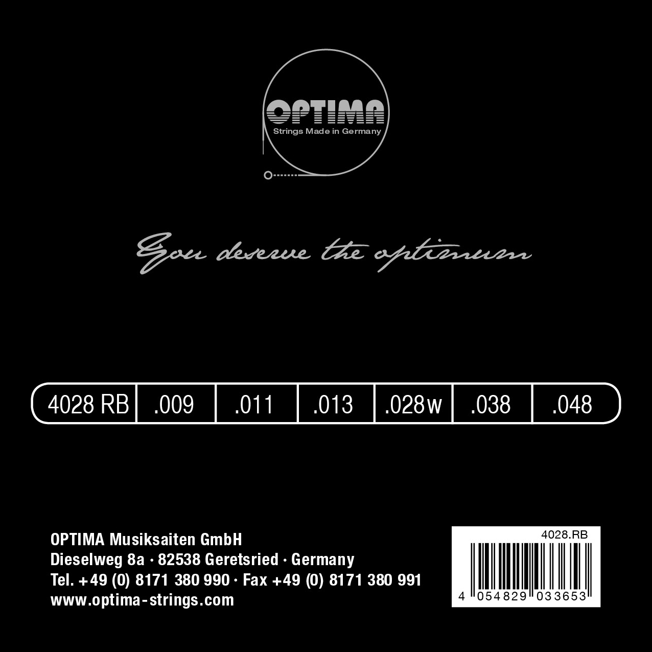 .009 .011 .013 .028w .038 .048 Nickel Plated Steel wound Electric Guitar Strings in roundwound design. The Optima 4028 Reference was developed to provide reliable and consistent playability. The premium NPS alloy ensures even response and stable intonation across the entire set. Developed for musicians who want to rely on their instrument. Developed and produced in Germany.