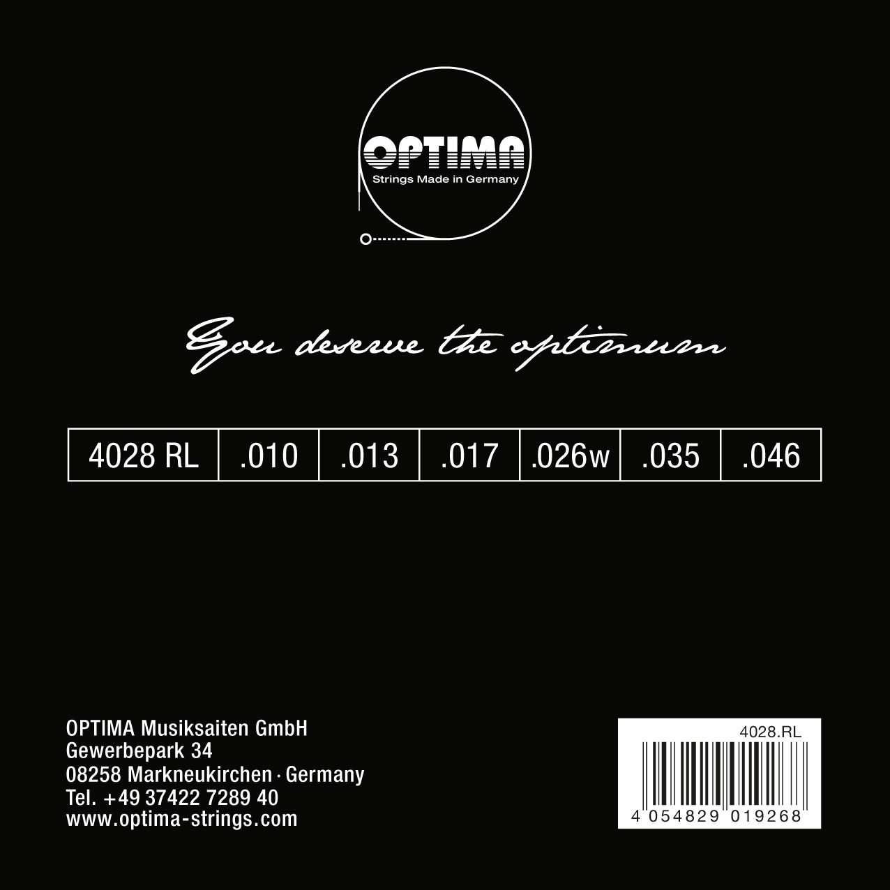 .010 .013 .017 .026w .035 .046 Nickel Plated Steel wound Electric Guitar Strings in roundwound design. The Optima 4028 Reference was developed to provide reliable and consistent playability. The premium NPS alloy ensures even response and stable intonation across the entire set. Developed for musicians who want to rely on their instrument. Developed and produced in Germany.