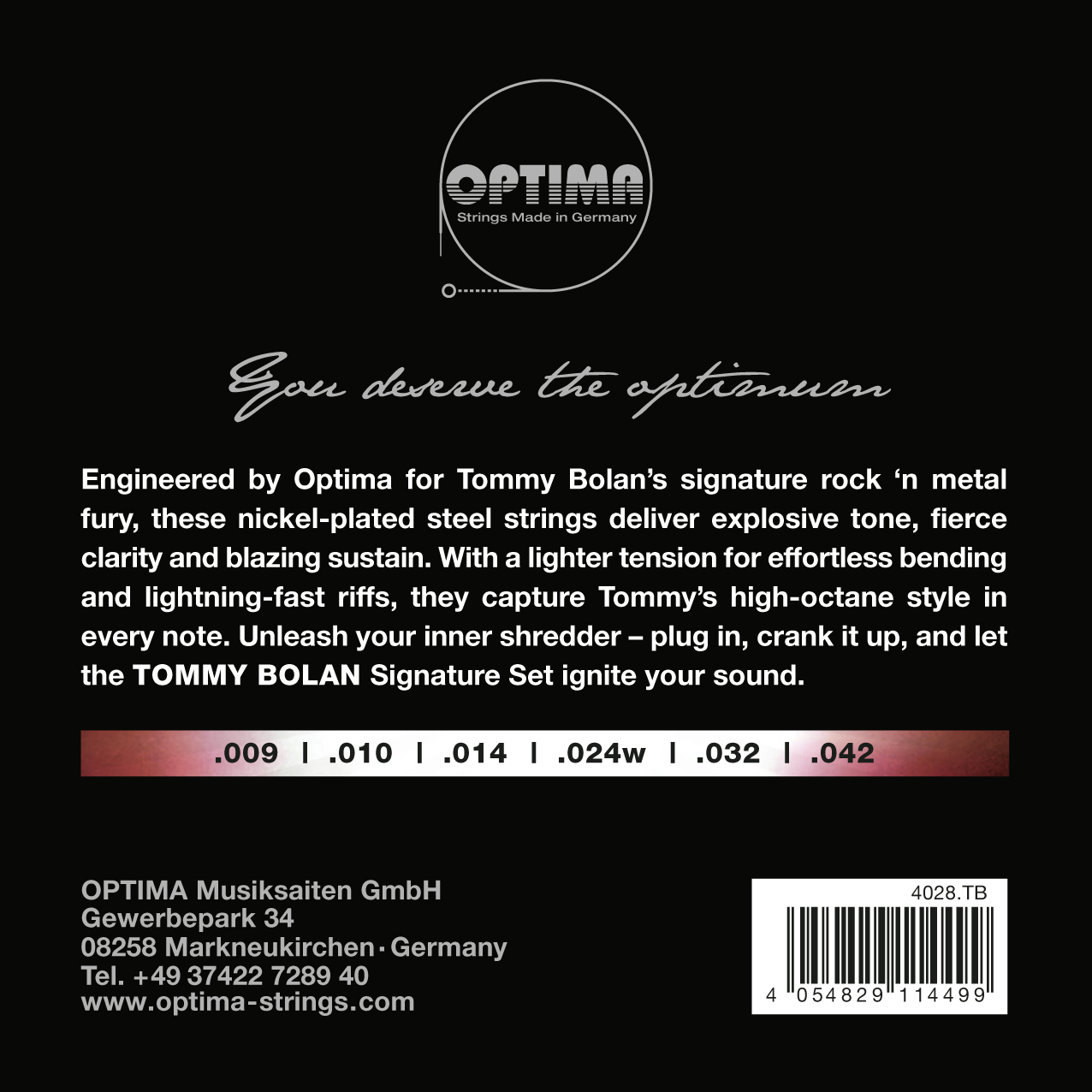 Engineered by Optima for Tommy Bolans signature rock n metal fury, these nickel-plated steel strings deliver explosive tone, fierce clarity and blazing sustain. With a lighter tension for effortless bending and lightning-fast riffs, they capture Tommys high-octane style in every note. Unleash your inner shredder plug in, crank it up, and let TOMMY BOLAN Signature Set ignite your sound.